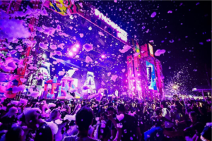 Suasana meriah di panggung utama penampilan A4A Clan di Synchronize Festival yang dipenuhi cahaya warna-warni dan foam,…