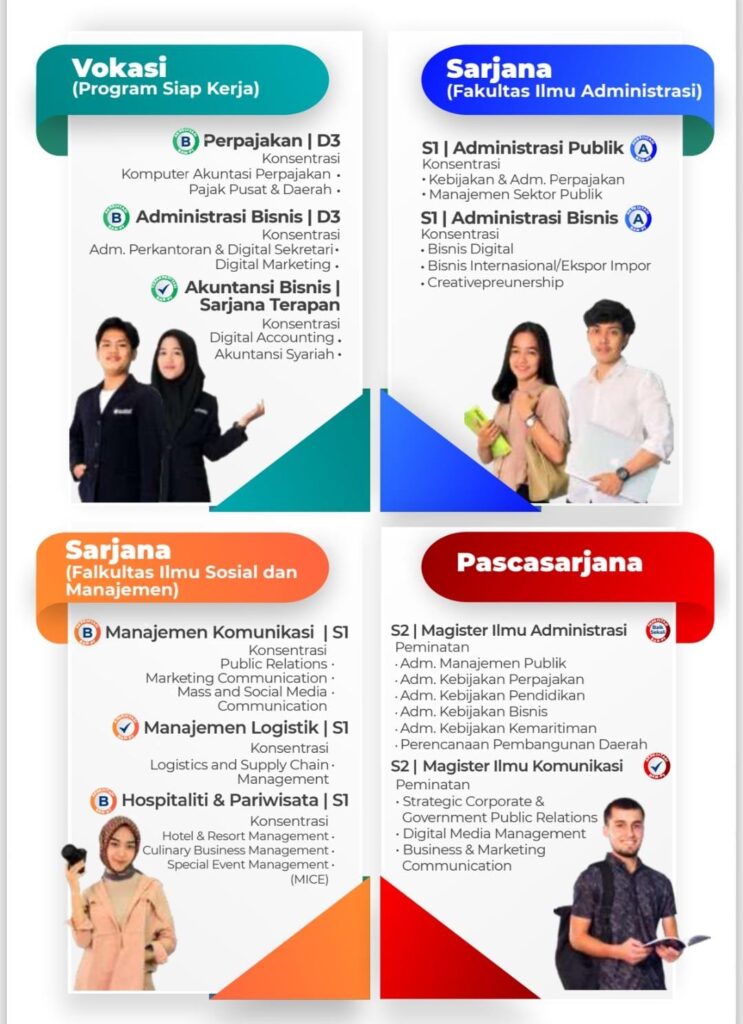 Kurikulum yang diterapkan selalu diperbarui untuk menyesuaikan dengan kebutuhan pasar kerja, serta didukung oleh dosen berkompeten yang juga praktisi di bidangnya. Fasilitas kampus yang modern termasuk perpustakaan digital dan laboratorium komputer siap mendukung proses belajar mengajar yang optimal.